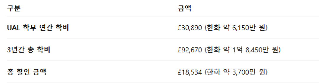 🔹 UAL 학부 학비: £30,890 / 연간 (한화 약 6,150만 원)